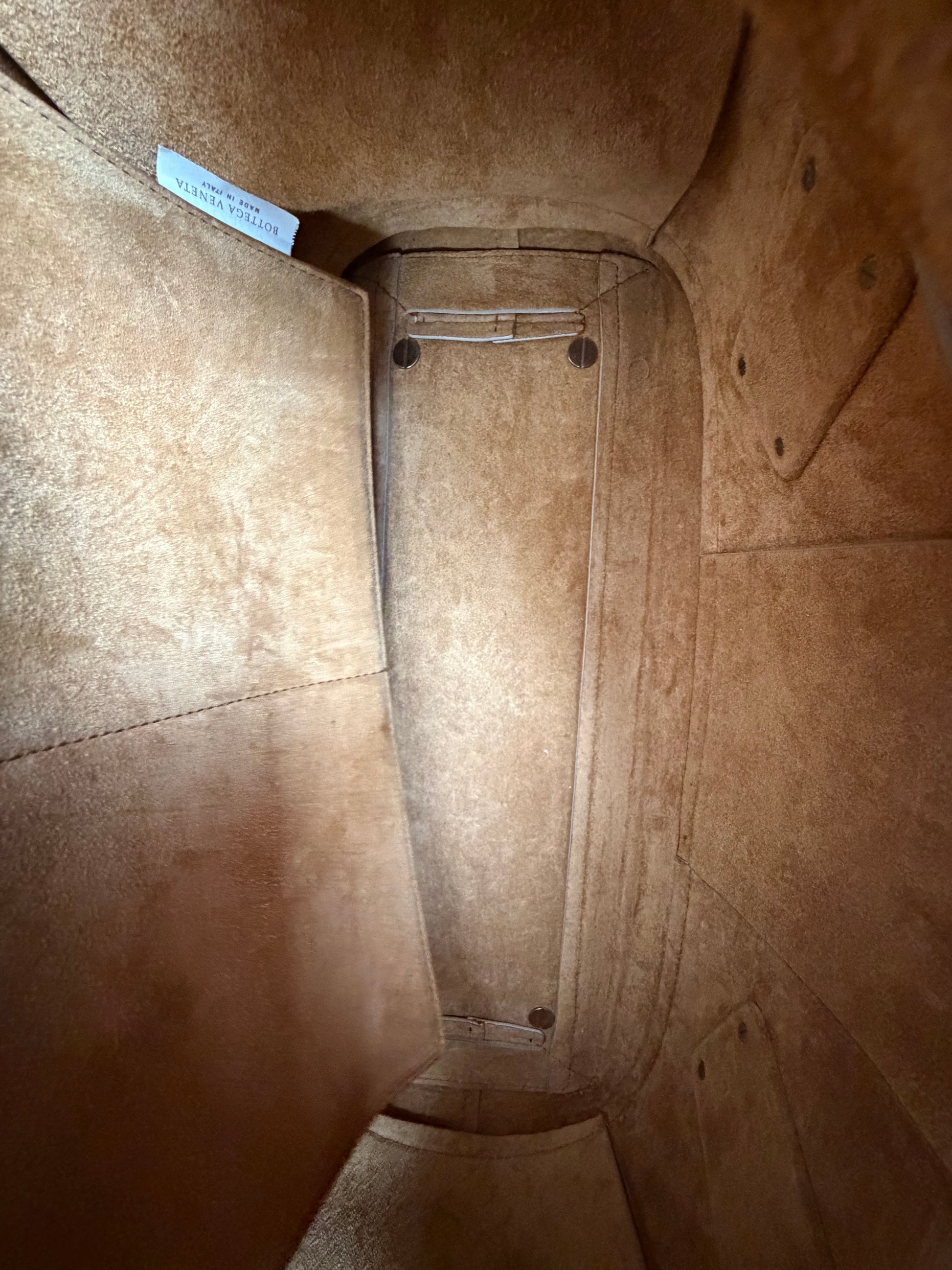 - Interior: Tan suede with zipper and slip pockets